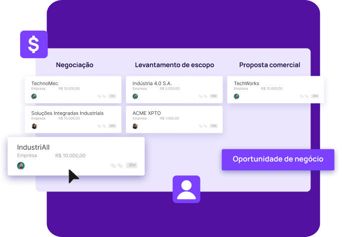 Tenha visão 360º de seus clientes, cadastre contatos, propostas, vendas, contratos, produtos, anexos, histórico e em um ambiente único.